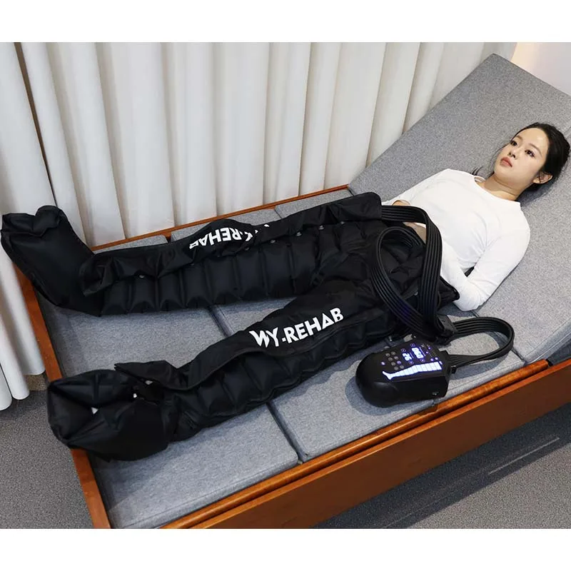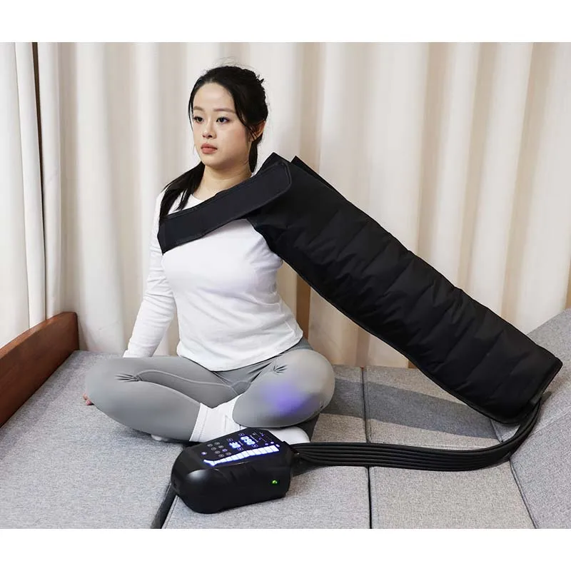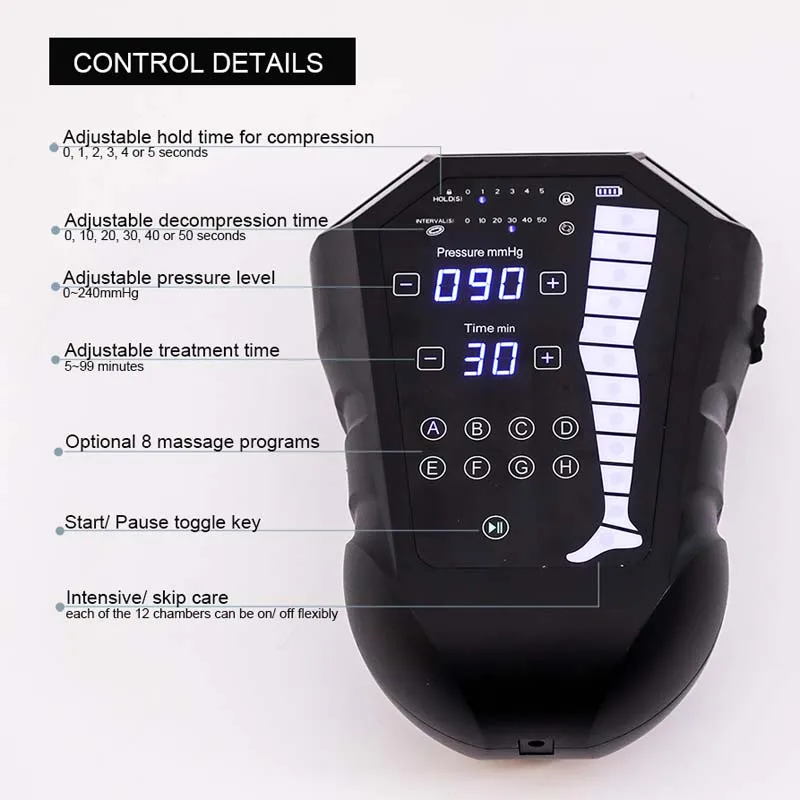 The core of this massage device's care lies in its 12-chamber air wave pressure system. These chambers generate a gradient pressure of 30-240 mmHg, simulating the squeezing motion of a human hand from the distal to the proximal end.