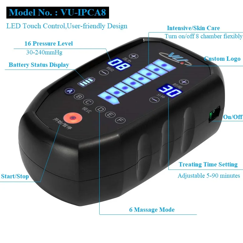 Weiyou Factory presents medical-grade air compression leg massage boots with custom logo options for clinics, spas, or sports teams. Featuring an 8-chamber sequential gradient system, these boots deliver precise pressure (30-240 mmHg) to enhance circulation, reduce swelling, and alleviate varicose veins or lymphedema. Ergonomic design ensures full leg coverage from feet to thighs, while adjustable settings cater to post-surgery recovery, athletic performance, or daily wellness. Lightweight and portable with a rechargeable pump, they’re trusted by physiotherapists for home or clinical use. Boost circulation, prevent DVT, and revitalize legs with this FDA-registered, professional-strength solution.