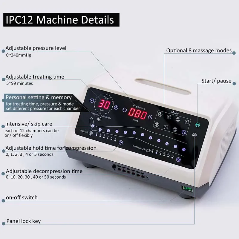 The 12 chambers can be switched on/ off independently, so it is possible to optimize the treatment for specific muscles or areas,as well as select areas, for example, are surgical wounds or other injuries that can not withstand treatment. |