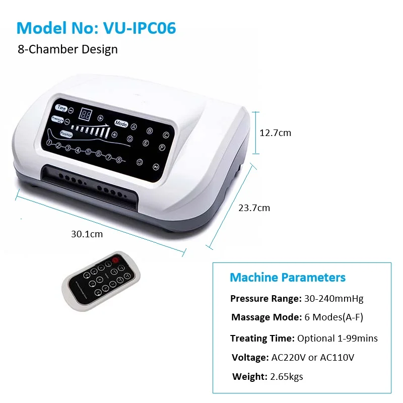 VU-IPC06 ir aprīkots ar 8 neatkarīgām gaisa kamerām, kas salīdzinājumā ar tradicionālajām 4 vai 6 kameru produktiem nodrošina smalkāku un precīzāku gradienta spiediena līkni, efektīvi imitējot „soļošanas sūkņa” efektu. Tas var nodrošināt medicīniskās kvalitātes dziļu audu masāžu operāciju pēc atveseļošanai, limfēdēmai un dziļai nogurumam pēc augstas intensitātes treniņiem sportistiem.