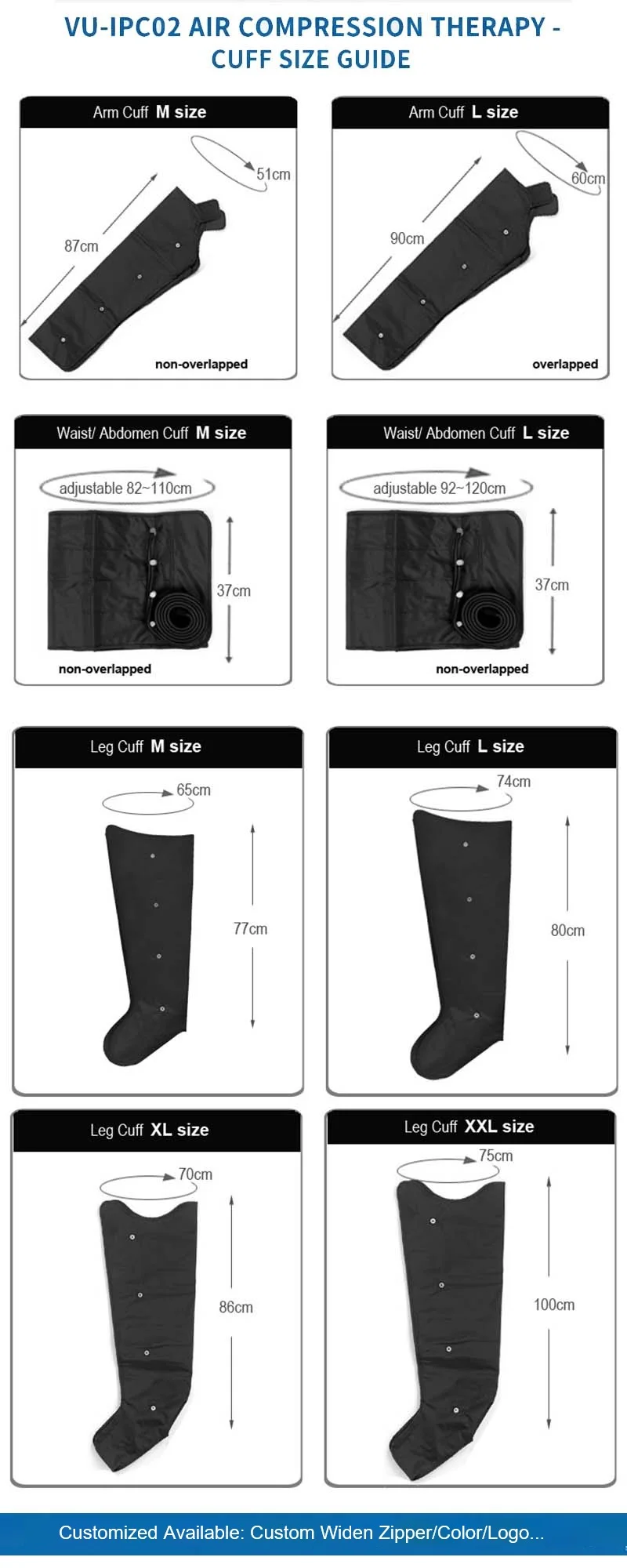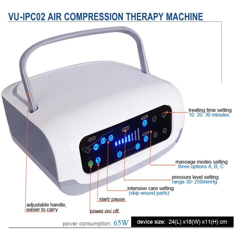 VU-IPC02 gaisa kompresijas masāžieris izmanto gaisa impulsu kompresijas tehnoloģiju, secīgi pielietojot spiedienu vairākās kamerās, lai panāktu gradienta masāžu no distālā līdz proksimālajam galam, efektīvi: