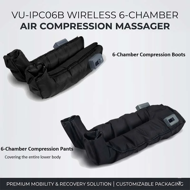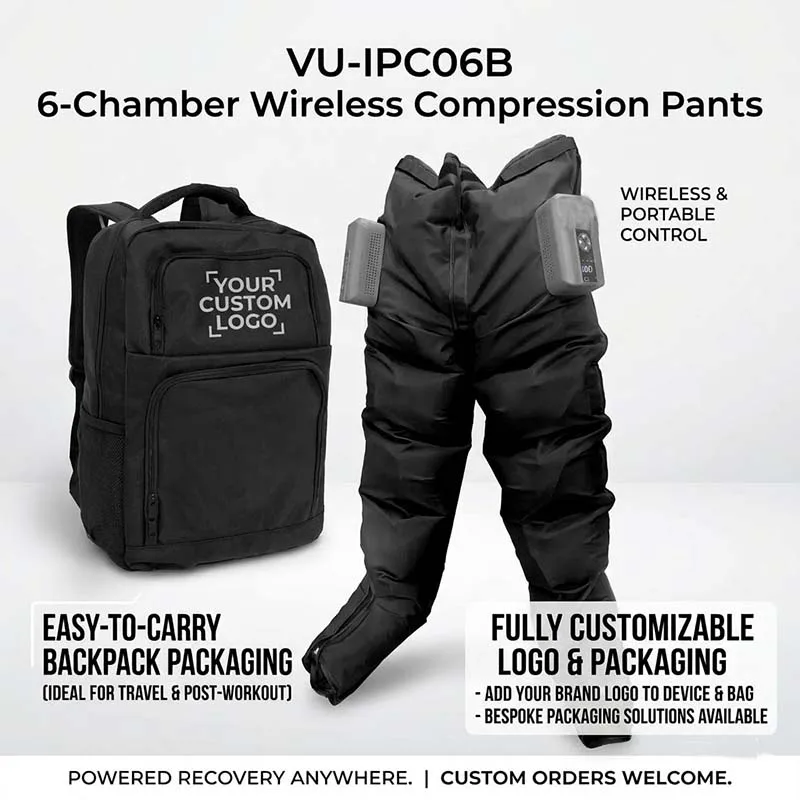 The VU-IPC06B 6-chamber compression pants main unit measures only approximately 16*10*6.1cm, with a foldable sleeve. Paired with a dedicated portable backpack, it encapsulates the entire professional recovery system in a small bag, specifically designed for post-sports recovery and travel scenarios, allowing efficient recovery to be carried with you.