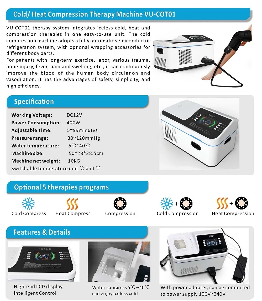 В области терапевтических устройств машина для термотерапии и компрессионной терапии VU-COT01 выделяется как прорывная инновация, предназначенная для всестороннего облегчения состояния и ускоренного восстановления. Это универсальное устройство гармонично объединяет терапию без использования льда, тепловую терапию и компрессионную терапию, обеспечивая универсальное решение для широкого спектра состояний.